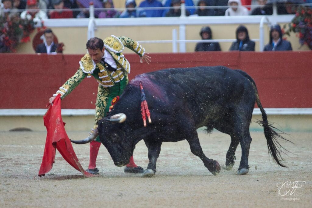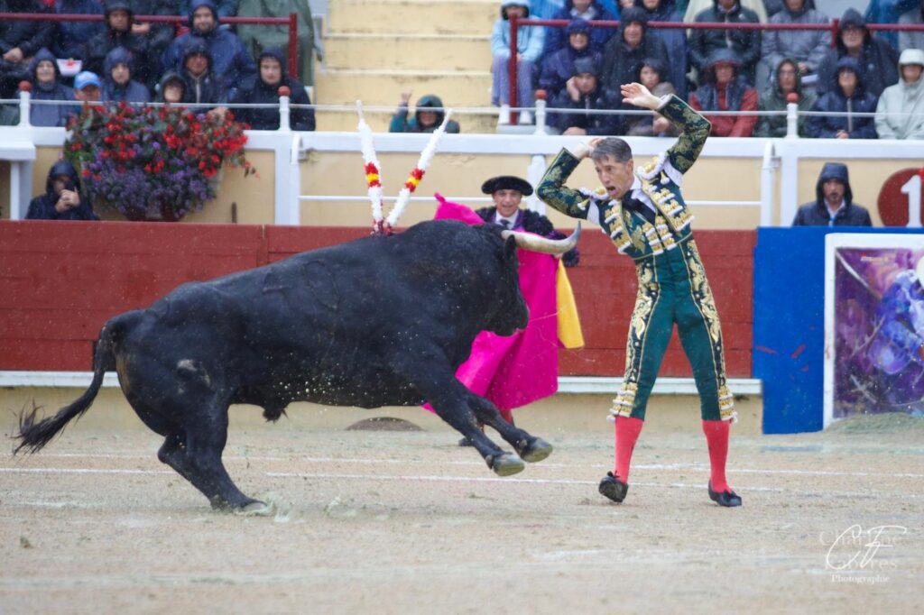 Ferrera ouvrit la tarde face à un toro corniabierto et mobile. Spectaculaire mais sans grand fond, son labeur séduisit le public avant que deux pinchazos et une entière ne limitent son succès à une oreille. Grièvement secoué au moment de porter l’épée, il gagna l’infirmerie, d’où il ressortit pour affronter le quatrième. Ce chorreado, aussi brave que pegajoso, l’obligea à se surpasser. Après un début lointain, il se redressa pour lier des séries profondes à droite, perdant toutefois les trophées avec l’épée puis repartant vers l’infirmerie, ovationné.