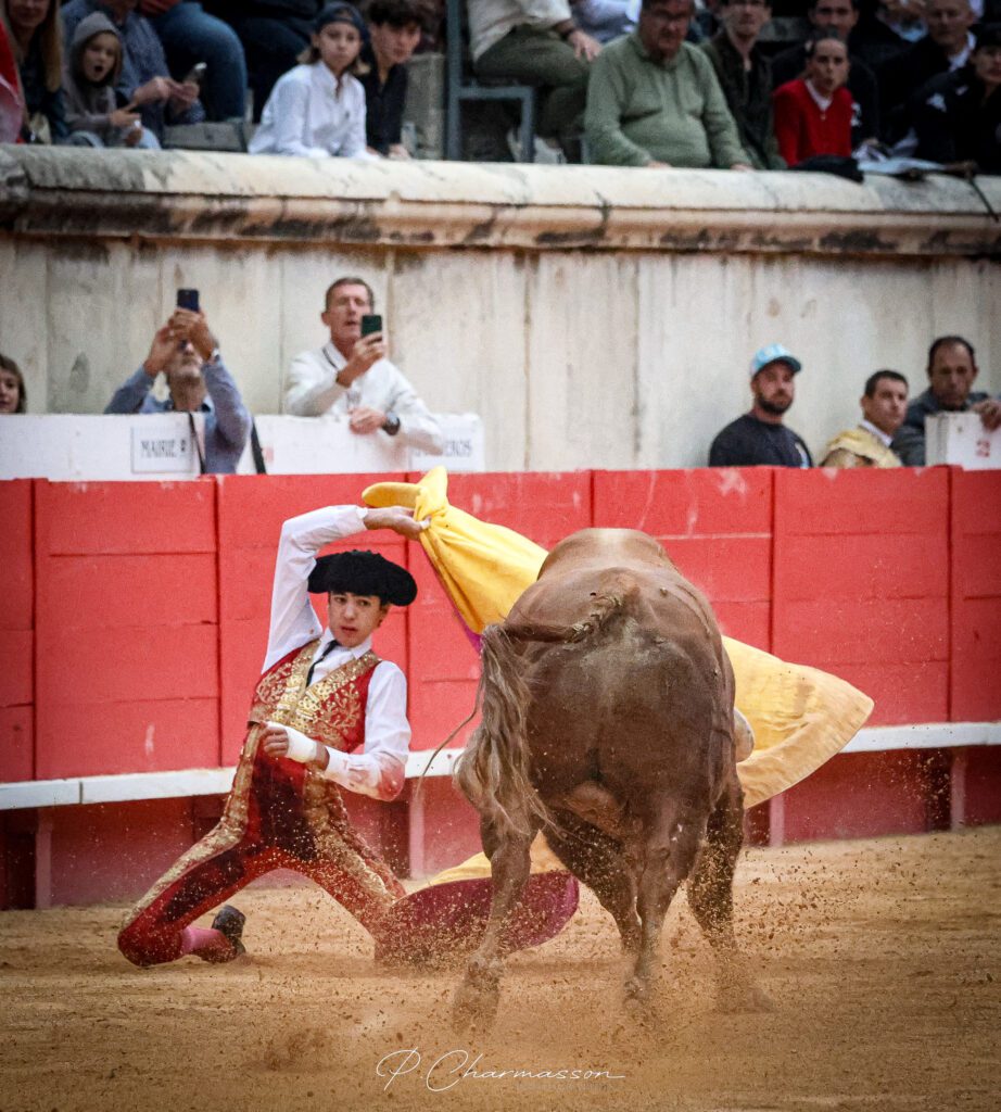 Jusqu’au cinquième toro, sorti sixième, cette course se déroulait pourtant sur un rythme hésitant. Les toros de Juan Pedro Domecq, empreints de noblesse mais limités de souffle et de moteur, imposaient à Marco Pérez un effort constant. Le jeune prodige dut puiser dans ses ressources pour leur donner de l’allant, arracher des séquences de beauté là où le fond manquait. Le combat était à l’intérieur même de ce grand « petit » bonhomme de 17 ans. Une lutte féroce et introspective pour maintenir vivante la flamme de la matinée. Il y mit tout ce que l’on peut y mettre et tout ce que l’on est en droit d’attendre d’un futur colosse. Le garçon a du sitio, du caractère et du cran. Il s’engage. S’agenouille, à porta gayola. Celle de Nîmes est un véritable détroit. Il sut comprendre la caste du troisième toro, pour s’y mettre au diapason, l’alpaguer dans sa sûre muleta avant de mal conclure, au recibir, et de se trancher la main. « Molinero », qui était un bon toro, guère compris par une partie de l’assemblée, fut « arrastré » dans un quasi-silence rompu de quelques palmas.