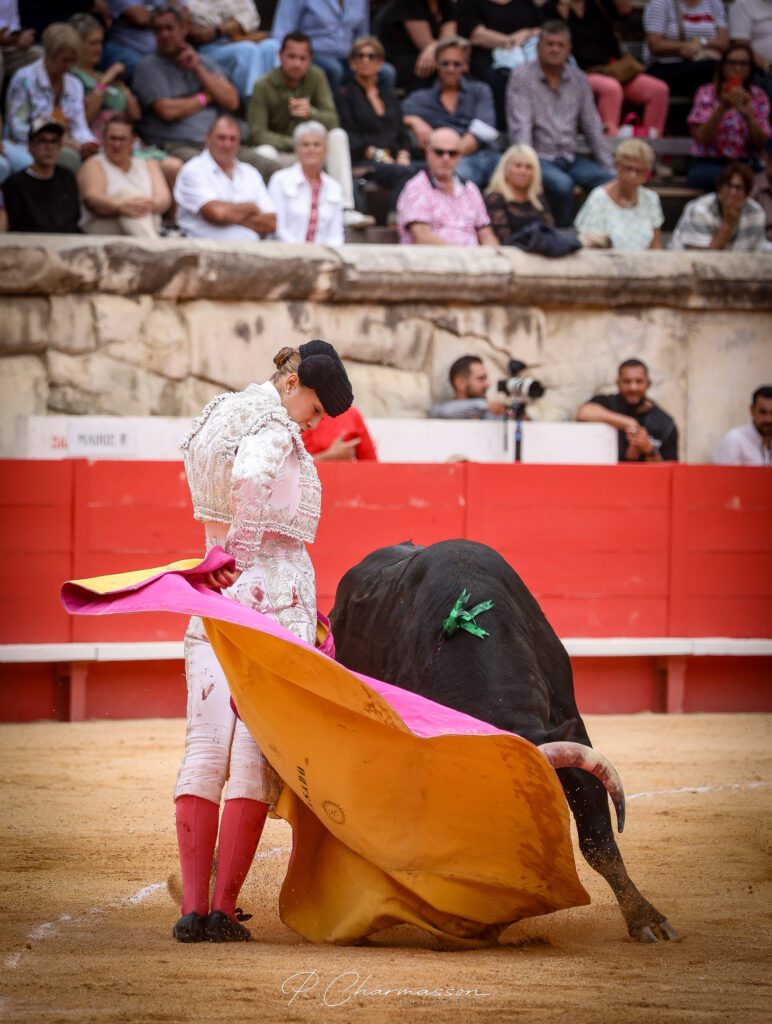 Je ne veux pas oublier Olga Casado, qui se présentait à Nîmes précédée d’une réputation flatteuse et chevillée d’une ambition grandissante. Le public des Arènes de Nîmes sut la recevoir comme l’on reçoit avec les honneurs les talents promis à un avenir radieux. Les Arènes de Nîmes lui sont, me semble-t-il, apparues grandes, face pourtant à deux petits novillos aux costumes bien étriqués pour une scène si imposante. La Madrilène a quelque chose que beaucoup d’autres n’ont pas : du talent et du caractère. Cela s’est vu par séquences éparses face à des Fuente Ymbro que l’on oubliera vite.
