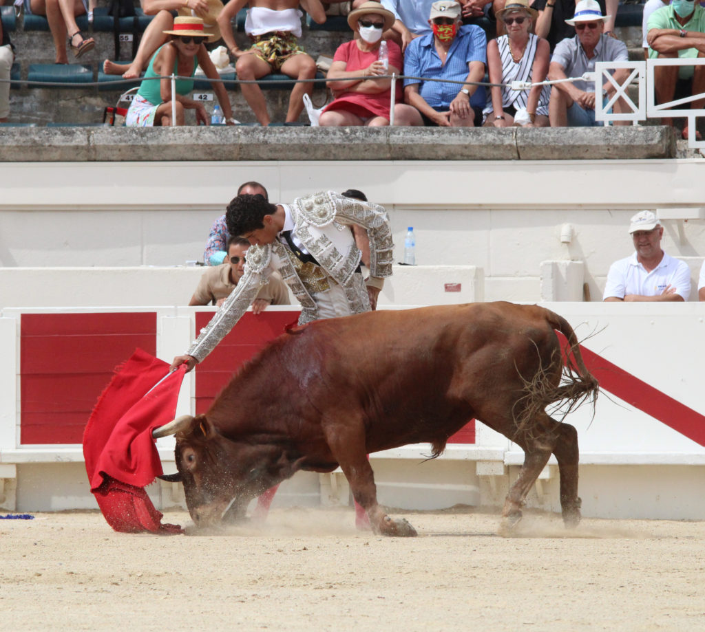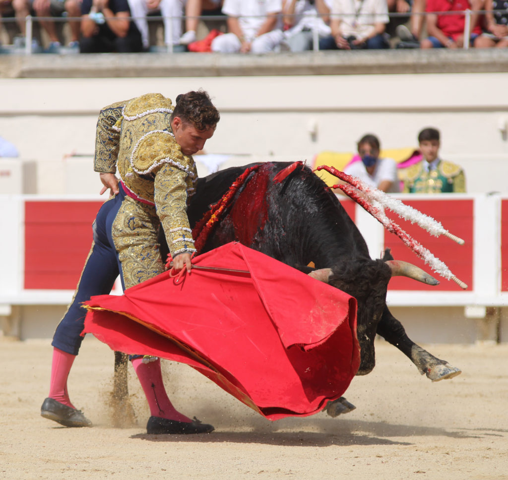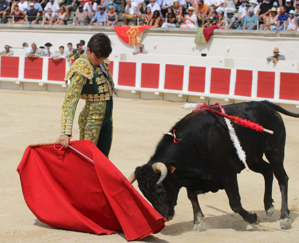 Tristan, de l’école taurine du pays d’Arles salua à porta gayola un Margé encasté qui ne facilita pas la charge des piétons dans le premier tiers. L’arlesien pris à sa charge la pose des banderilles pour un tiers irrégulier conclu au quiebro. Tristan composa ensuite une faena décousue, comprenant quelques passages droitiers au joli tracé sans jamais toutefois prendre la mesure de son adversaire. Passage gaucher peu fructueux avant retour à tribord pour quelques séquences correctes dans un ensemble manquant de liant. Conclusion par trois-quart de lame tendida puis entière, tendida elle aussi avant de liquider le fauve par un coup de verdugillo.