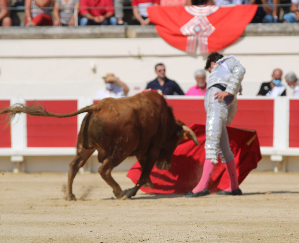 Lenny Martin de l’école taurine locale salua correctement l’ultime avant que Christian Parejo ne se signale par delantales. Réponse de Lenny par chicuelinas puis farol de rodillas lui valant un spectaculaire accrochage sans conséquences apparentes. Muleta en main, Lenny Martin édita une faena appliquée sur les deux bords avec une préférence personnelle pour les passages droitiers. Labeur d’intensité inégale au même titre que les émotions, malgré quelques passages allurés. Final par manoletinas avec sévère accrochage à la clé. Trois quart de lame plate un poil longue d’effet nécessitant l’usage du descabello, puis à nouveau de l’épée de mort pour une entière tendida faisant effet sur le fil du rasoir à la limite du troisième avis.
