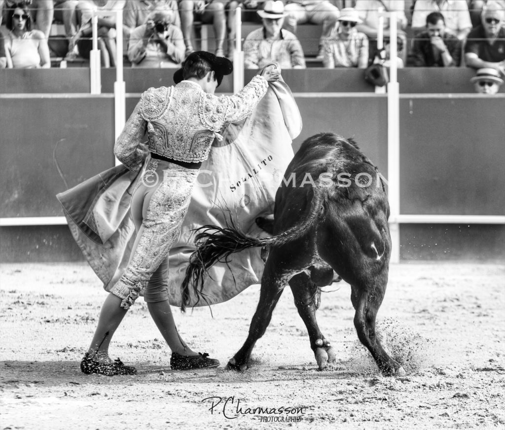 Le nîmois Solalito mis d’emblée la barre haute devant l’excellent second « Trasquito », que le gardois honora d’une larga cambiada de rodillas, bon capoteo puis chicuelinas marchées pour conduire le fauve vers l’unique rencontre, prise sans s’y employer outre mesure. Solalito se fit ensuite applaudir en se montrant allègre et brillant banderilles en main, pour trois paires posées avec aplomb, la 3eme au quiebro près des tablas. Un très bon Solal ensuite muleta en main, profitant des charges vibrantes de « Trasquito », un utrero mobile et encasté sur les deux bords. Guidé par Luisito, le torero de Nîmes se montra autoritaire et firme sur la diestra, captant bien les embestidas de son opposant, tout en prenant le soin d’aller au bout de ses muletazos. Plus suave sur la gauche, le nîmois signa plusieurs naturelles très abouties avant final par manoletinas. Mete y saca puis estoconazo. Deux oreilles chaleureusement fêtées et vuelta au brave Valdefresno. Le quinto malo « Pitillero » qui était fait d’une autre matière fonça vers la pièce montée avec force par deux fois, davantage par violence que bravoure. Une animosité que le bicho confirma dans le dernier tiers, après que Solal l’ait banderillé avec sincérité. Décasté et très vite aplomado, le Valdefresno était un diable à la charge de plus en plus raccourcie. Solalito s’arrimé et tenta de l’intéresser sur plusieurs séquences arrachées avec pundonor au prix d’un effort notable. Deux pinchazos au fil des tablas avant quasi entière sur tendida.
