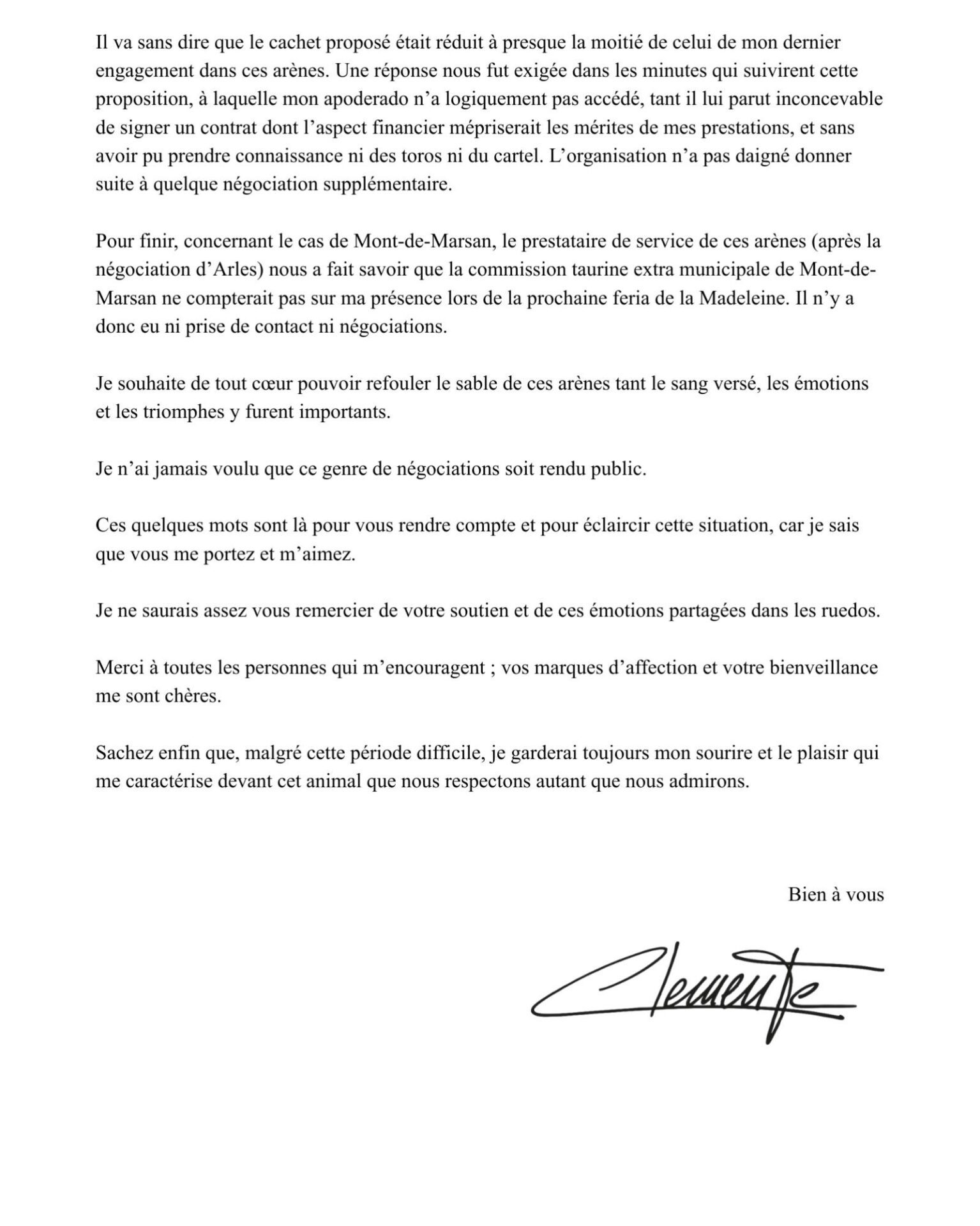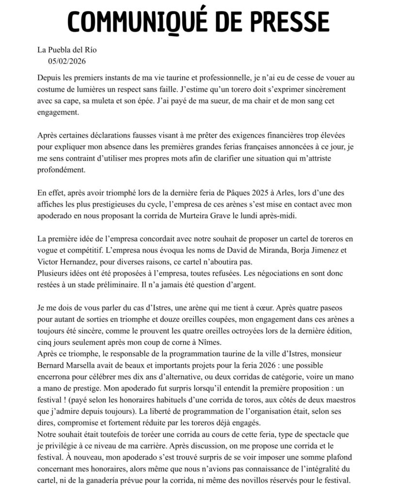 Communiqué officiel du matador de toros CLÉMENTE au sujet de son absence des premières ferias … par Pcharmasson | Fév 5, 2026 | Actualités | 0 commentaires Poster le commentaire Annuler la réponseVotre adresse e-mail ne sera pas publiée. Les champs obligatoires sont indiqués avec *Commentaire Nom * E-mail * Site web Résoudre : * 26 − 7 =