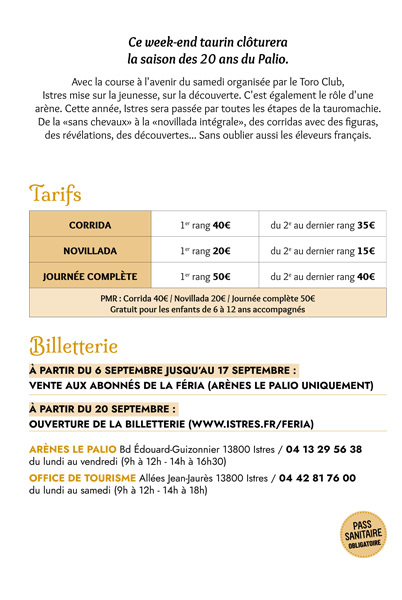 Petit rappel concernant l’ouverture de la billetterie pour les abonnés de la féria, le lundi 6 septembre, aux arènes uniquement : 04 13 29 56 38