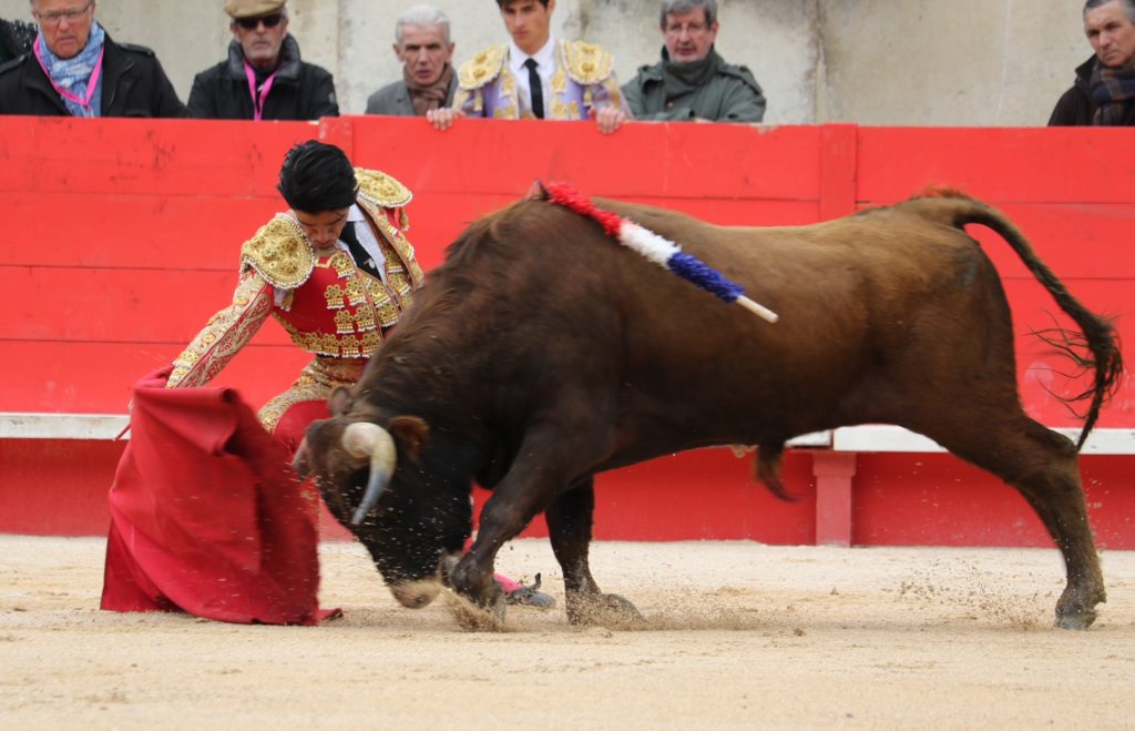 Fabien Castellani découvrait Nîmes devant un animal de Barcelo qui permit quelques mouvements de cape de correcte facture avant que Juanito ne vienne au quite, par chicuelinas, l’une d’elles particulièrement bien exécutée main basse. Muleta en main, le torero arlésien eu toute les peines du monde à canaliser les charges rythmées d’un Barcelo vibrant et très mobile. Fabien peina à enchainer et fut désarmé à deux reprises malgré quelques bons mouvements isolés. Entière en arrière et tendida suivie d’une flopée de descabellos.