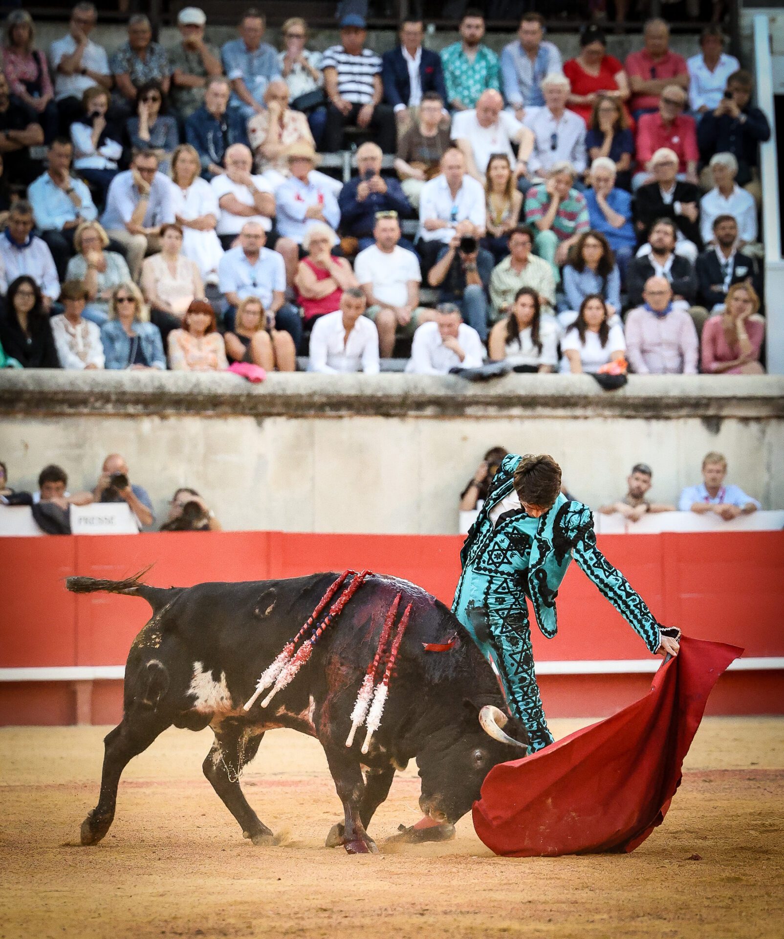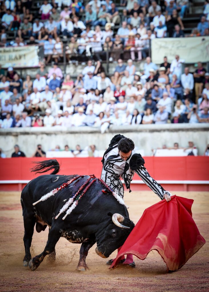 Les Arènes de Nîmes avaient enregistré une belle entrée en ce vendredi de Feria des Vendanges avec une affiche rendant hommage aux 150 ans de l’Opéra de Carmen. Pour l’occasion, la piste du ruedo nîmois avait été décorée par une peinture splendide du peintre local Jules Milhau. Avant que la terna ne déboule, un ballet magnifiquement ficelé avait pris corps en piste avec la présence d’une quarantaine de danseuses sevillanes, Marion Luna splendide dans le rôle de Carmen, Valentine Lemercier à la voix accompagnée par l’orchestre Chicuelo II sous le houlette de son chef Rudy Nazy.