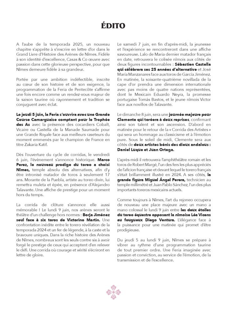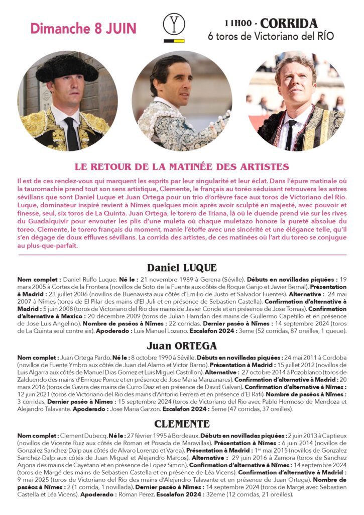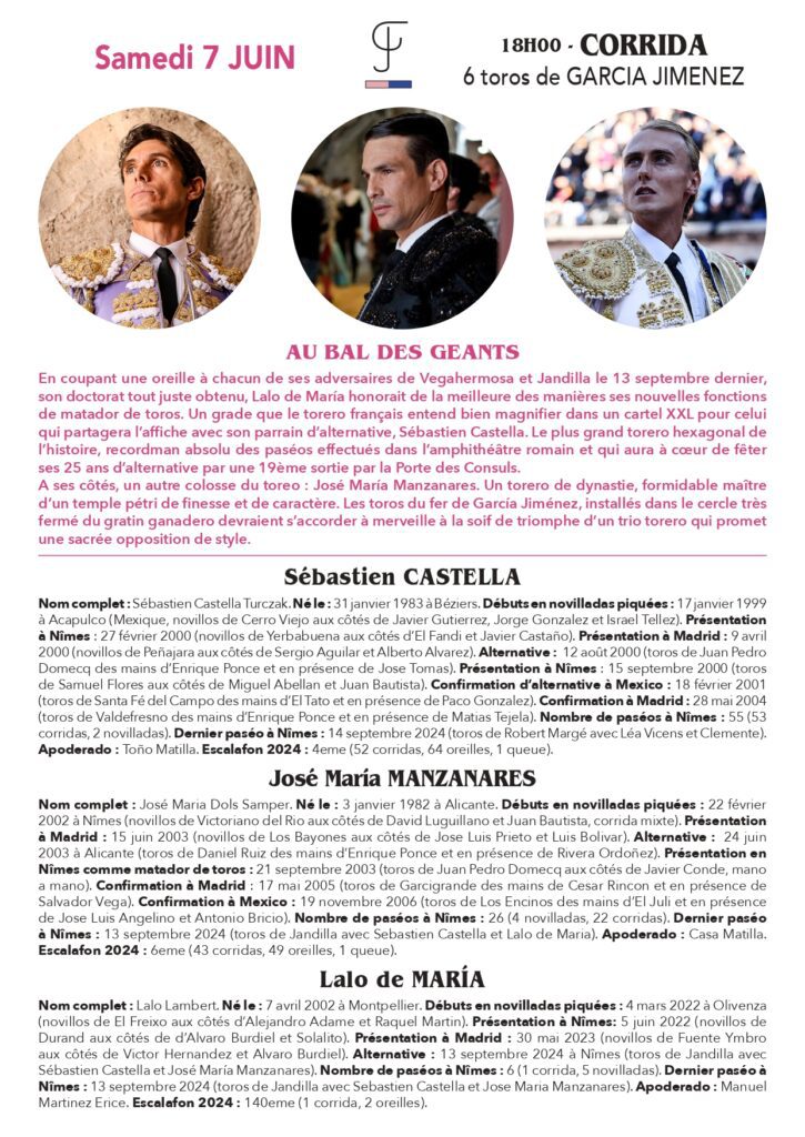 Pour cette première feria de la saison nîmois, le public gardois retrouvera Sebastien Castella qui fête ses 25 ans d’alternative le samedi après-midi aux côtés du dernier matador de toros français en date, Lalo de Maria. Autre diestro hexagonal à l’honneur : Clemente. Le torero bordelais se voit récompensé de sa grande temporada 2024 et une confirmation réussie dans le Gard pour les Vendanges avec une double comparution, dimanche matin à l’occasion de la corrida dite des “artistes” puis en fin d’après-midi où l’aquitain retrouvera les toros de Robert Margé.