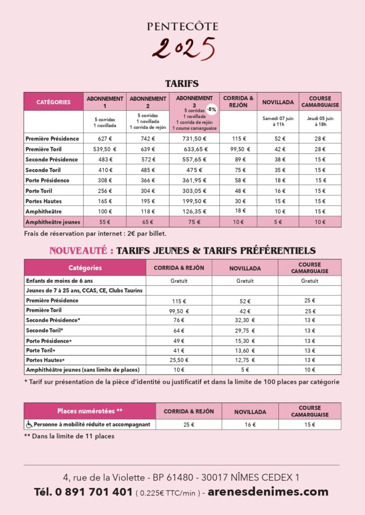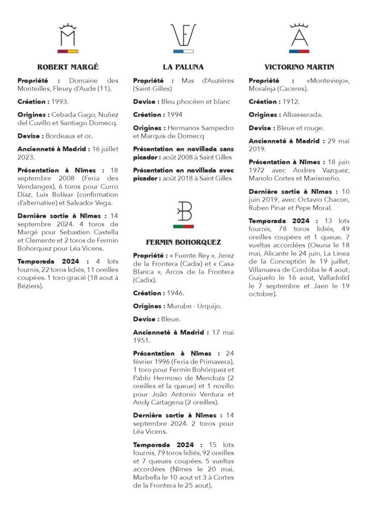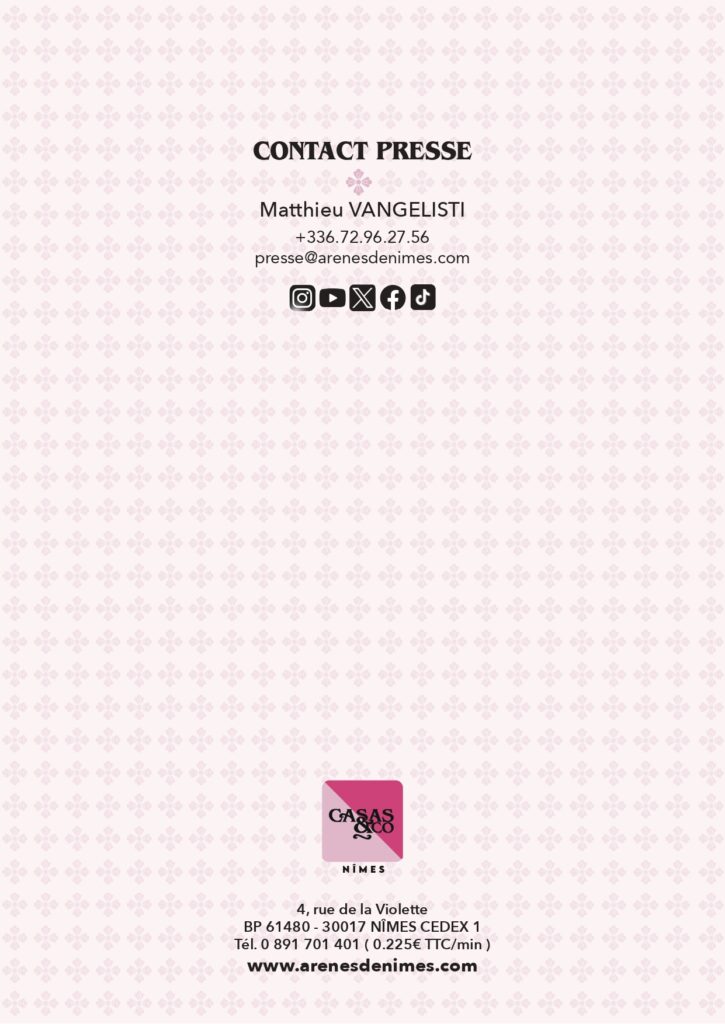 La traditionnelle corrida de rejon sera l’occasion de nouvelles envolées pour les retrouvailles entre les deux stars de la discipline, Diego Ventura et la nîmoise Léa Vicens pour un mano a mano prometteur. Enfin, la novillada de la Cape d’Or prendra des allures de rencontre internationale avec notamment la présence du jeune nîmois Victor Clauzel aux côtés de la pépite portugaise Tomas Bastos devant des novillos d’Alejandro Talavante pour une première à Nîmes en qualité de ganadero…