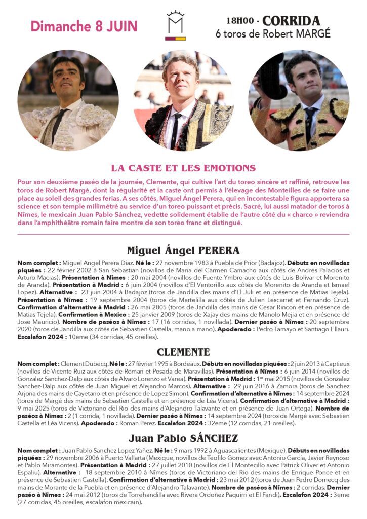 Dimanche 8 juin à 18h : Toros de Robert Margé pour Miguel Angel Perera, Juan Pablo Sanchez et Clemente