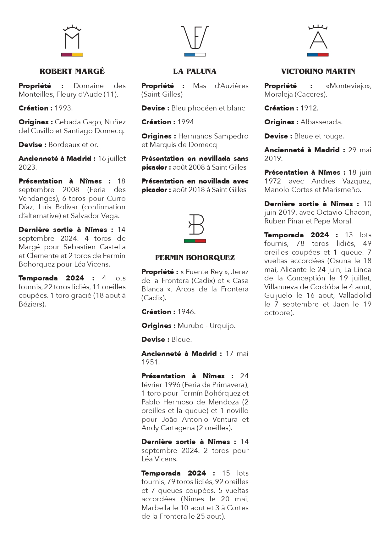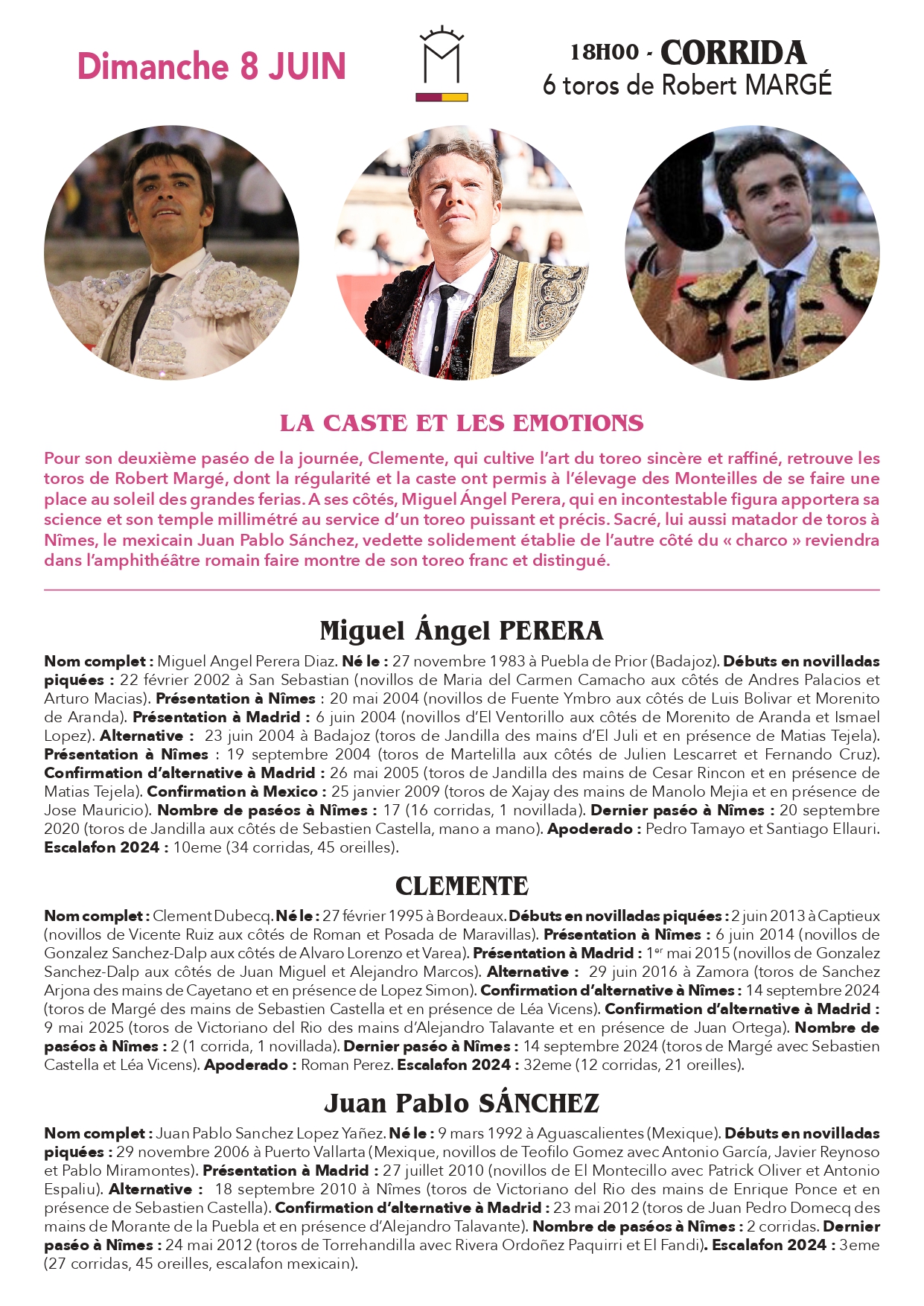 Pour cette première feria de la saison nîmois, le public gardois retrouvera Sebastien Castella qui fête ses 25 ans d’alternative le samedi après-midi aux côtés du dernier matador de toros français en date, Lalo de Maria. Autre diestro hexagonal à l’honneur : Clemente. Le torero bordelais se voit récompensé de sa grande temporada 2024 et une confirmation réussie dans le Gard pour les Vendanges avec une double comparution, dimanche matin à l’occasion de la corrida dite des “artistes” puis en fin d’après-midi où l’aquitain retrouvera les toros de Robert Margé.
