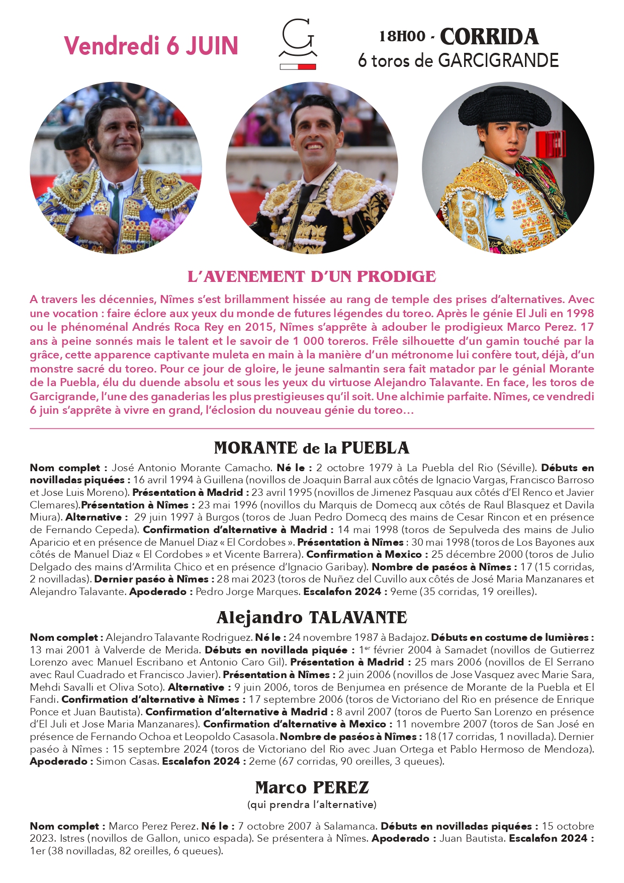 Vendredi 6 juin à 18 h : Toros de Garcigrande pour Morante de la Puebla, Alejandro Talavante et Marco Perez qui prendra l’alternative