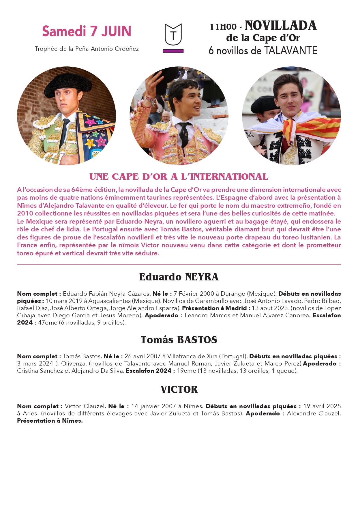 La traditionnelle corrida de rejon sera l’occasion de nouvelles envolées pour les retrouvailles entre les deux stars de la discipline, Diego Ventura et la nîmoise Léa Vicens pour un mano a mano prometteur. Enfin, la novillada de la Cape d’Or prendra des allures de rencontre internationale avec notamment la présence du jeune nîmois Victor Clauzel aux côtés de la pépite portugaise Tomas Bastos devant des novillos d’Alejandro Talavante pour une première à Nîmes en qualité de ganadero…