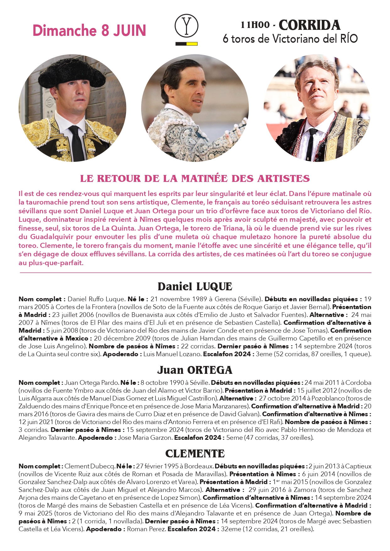 Dimanche 8 juin à 11h30 : Toros de Victoriano del Rio pour Daniel Luque, Juan Ortega et Clemente