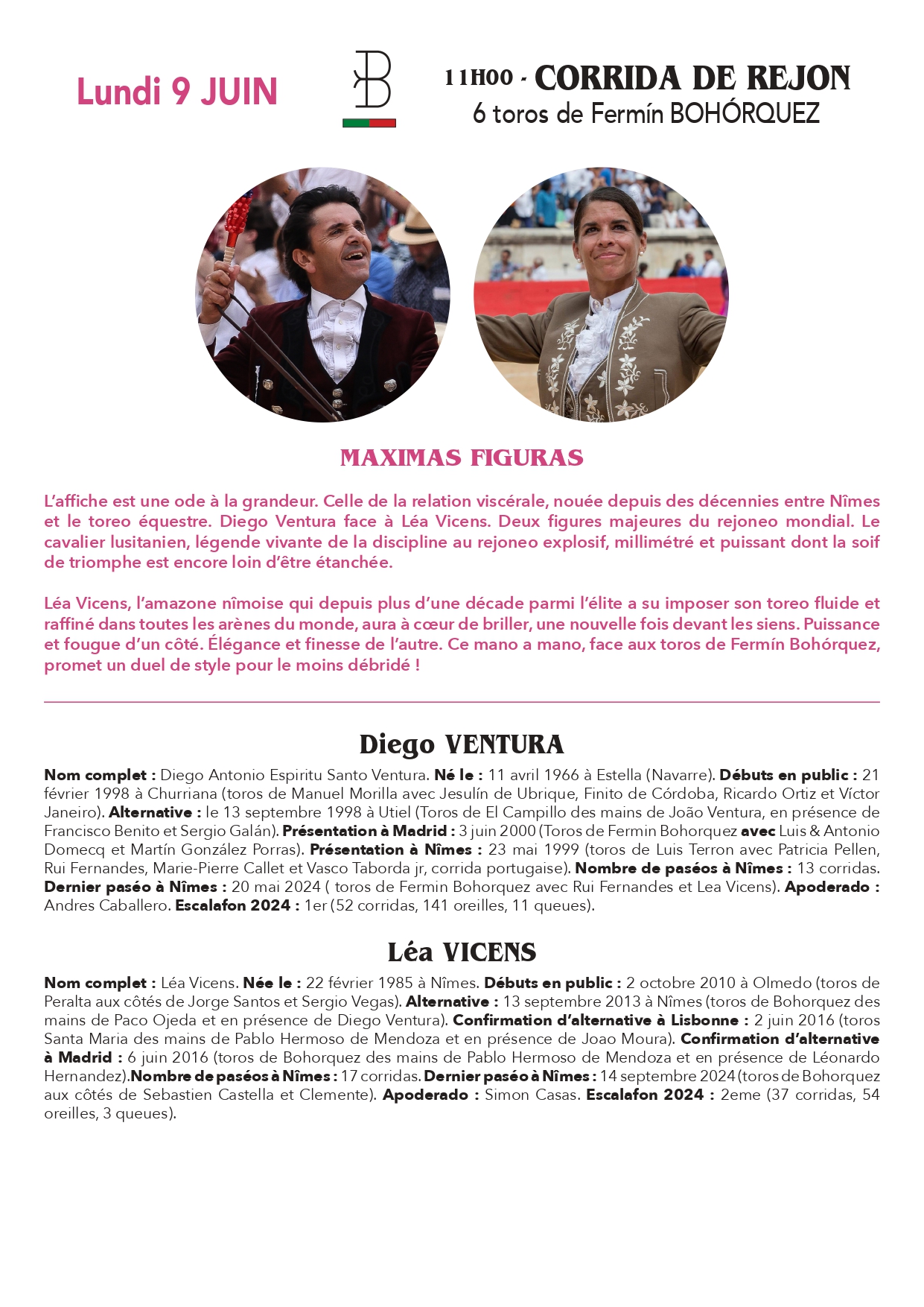 Lundi 9 juin à 11h30 : Toros de Bohorquez pour Diego Ventura et Léa Vicens, mano a mano