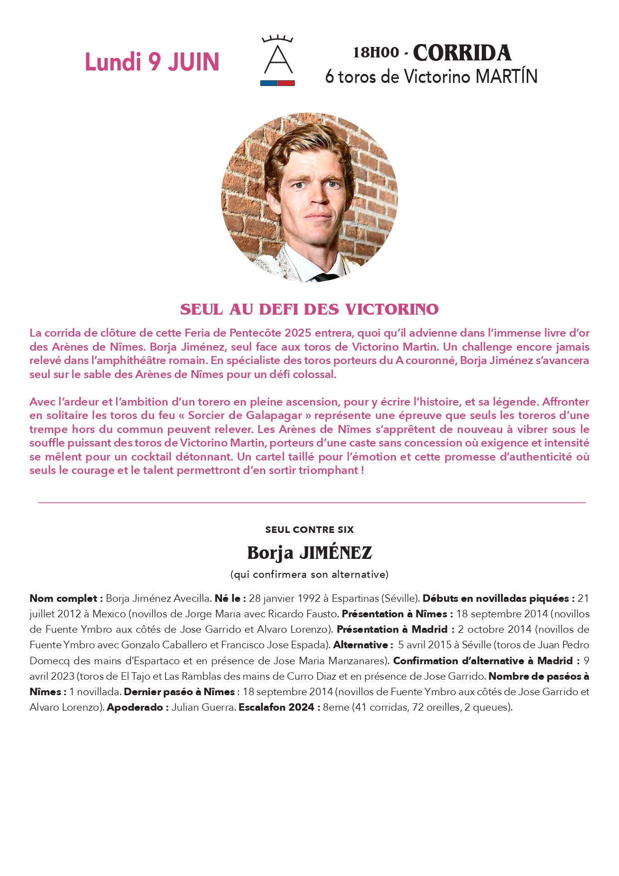Lundi 9 juin à 18h : Toros de Victorino Martin pour Borja Jimenez qui confirmera l’alternative, seul contre six.