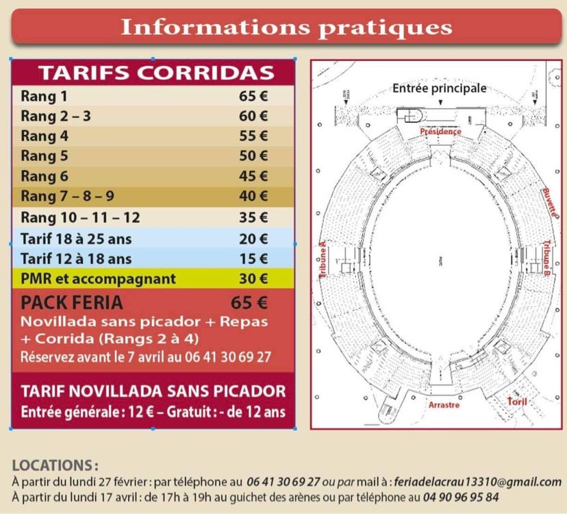 A partir du lundi 17 avril , les réservations pourront se faire directement au guichet des arènes de 17h à 19h ou par téléphone au 04 90 96 95 84