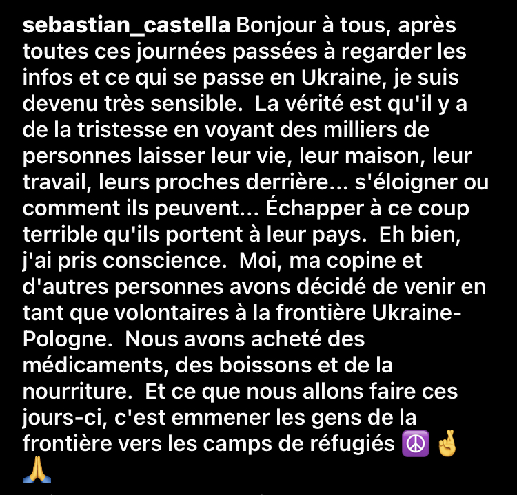 Très touché par toutes ses familles devenues réfugiées, démunies face à l’immondice humaine qui ne devrait pas avoir sa place sur cette terre en 2022, le matador de Béziers a décidé de se rendre avec sa compagne et quelques amis à la frontière entre l’Ukraine et la Pologne, pays dont il puise une partie de ses origines. Sebastien Castella et ses amis ont réunis médicaments, boissons et nourriture afin de venir en aide au réfugiés ukrainiens.