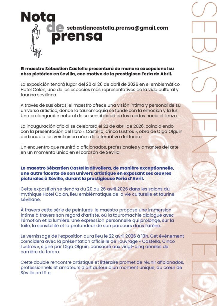 - SEBASTIEN CASTELLA va bientôt exposer à Séville pour la Feria d’Avril !